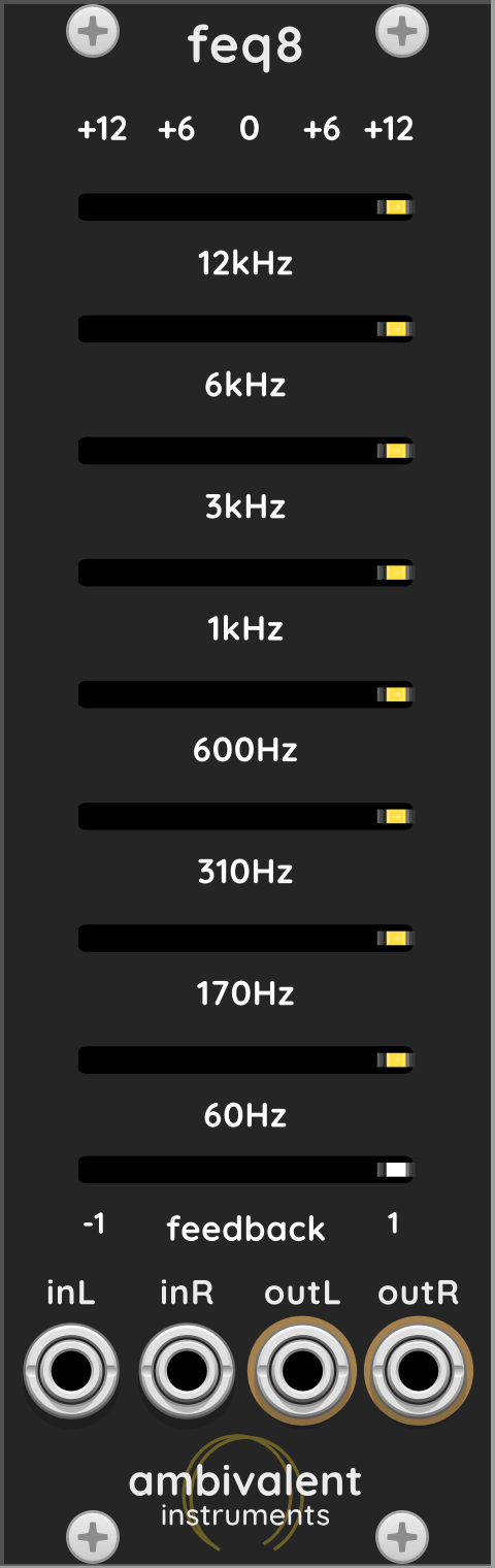 Stereo 8-band parametric equalizer (fixed peaking and shelf bands) with one global feedback control (±95%) for resonance and self-osc. In-loop limiter and DC block stabilize the loop; output is the dry EQ signal.