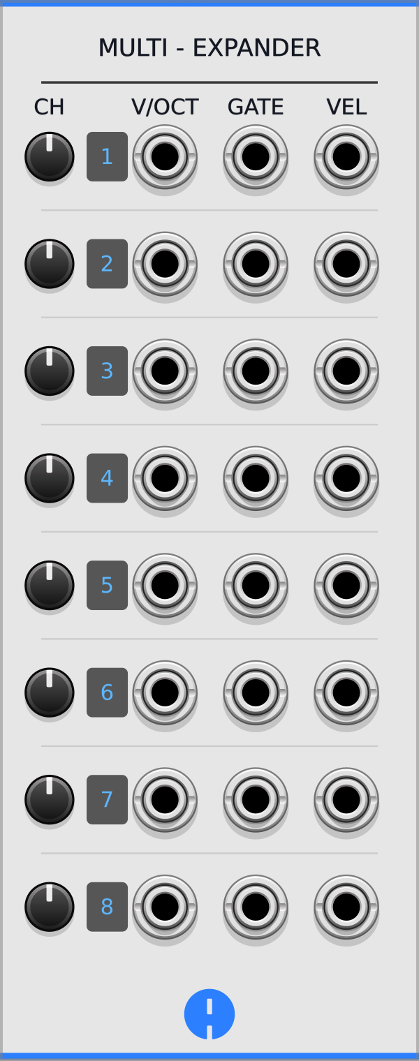 10HP Expander for OXI-CV. Adds 8 configurable tracks with V/Oct, Gate, and Velocity outputs.