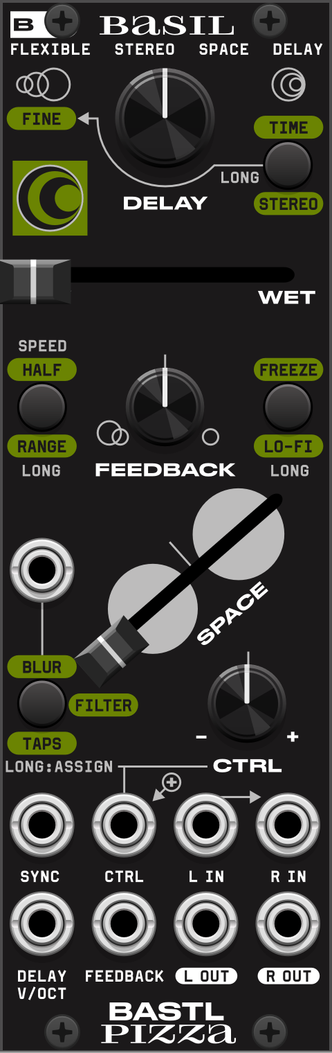 Basil is a compact, yet flexible, digital stereo delay module built on the Bastl Pizza platform.